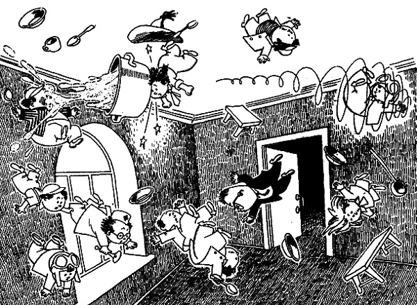 — Ну что за шутки ещё! — завизжал Пончик. — Прекратите сейчас же! У меня голова кружится! Почему стены шатаются? Почему всё перевернулось вверх дном?