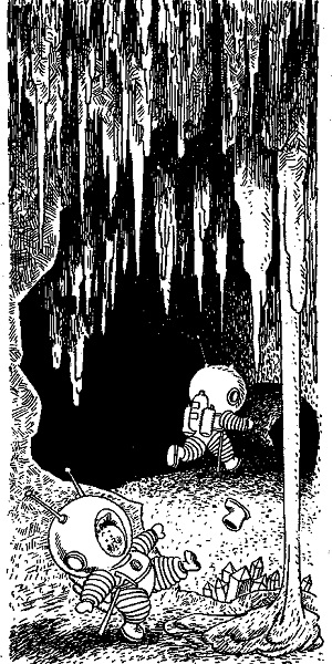 Здесь было гораздо прохладнее и уютнее, чем под открытым небом. Пончику перестало казаться, что он вот-вот выскочит из своих сапог и унесётся в мировое пространство. Теперь он видел над головой не звёздное небо, а каменистые своды пещеры и чувствовал, что если и полетит, то не сможет улететь далеко. Стащив с ног космические сапоги и усевшись поудобней на гладком камне, который лежал у стены пещеры, Пончик принялся отдыхать.