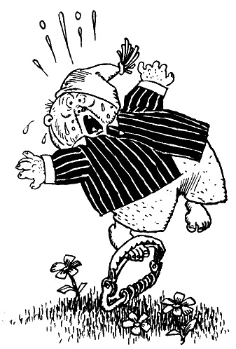Ничего не подозревая, Незнайка продолжал уплетать малину, как вдруг снизу раздался щелчок, и он почувствовал, как его что-то крепко схватило за ногу. Незнайка вскрикнул от боли и, нагнувшись, увидел, что нога его попала в капкан. В этот же момент следивший за каждым его шагом Фикс выскочил из своей засады и, подбежав к Незнайке, изо всех сил стукнул его метлой по голове.